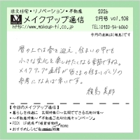 メイクアップ通信1月号を掲載いたしました。日々の暮らしや住まいづくりの参考として、皆さまにお役立ていただけましたら幸いです。